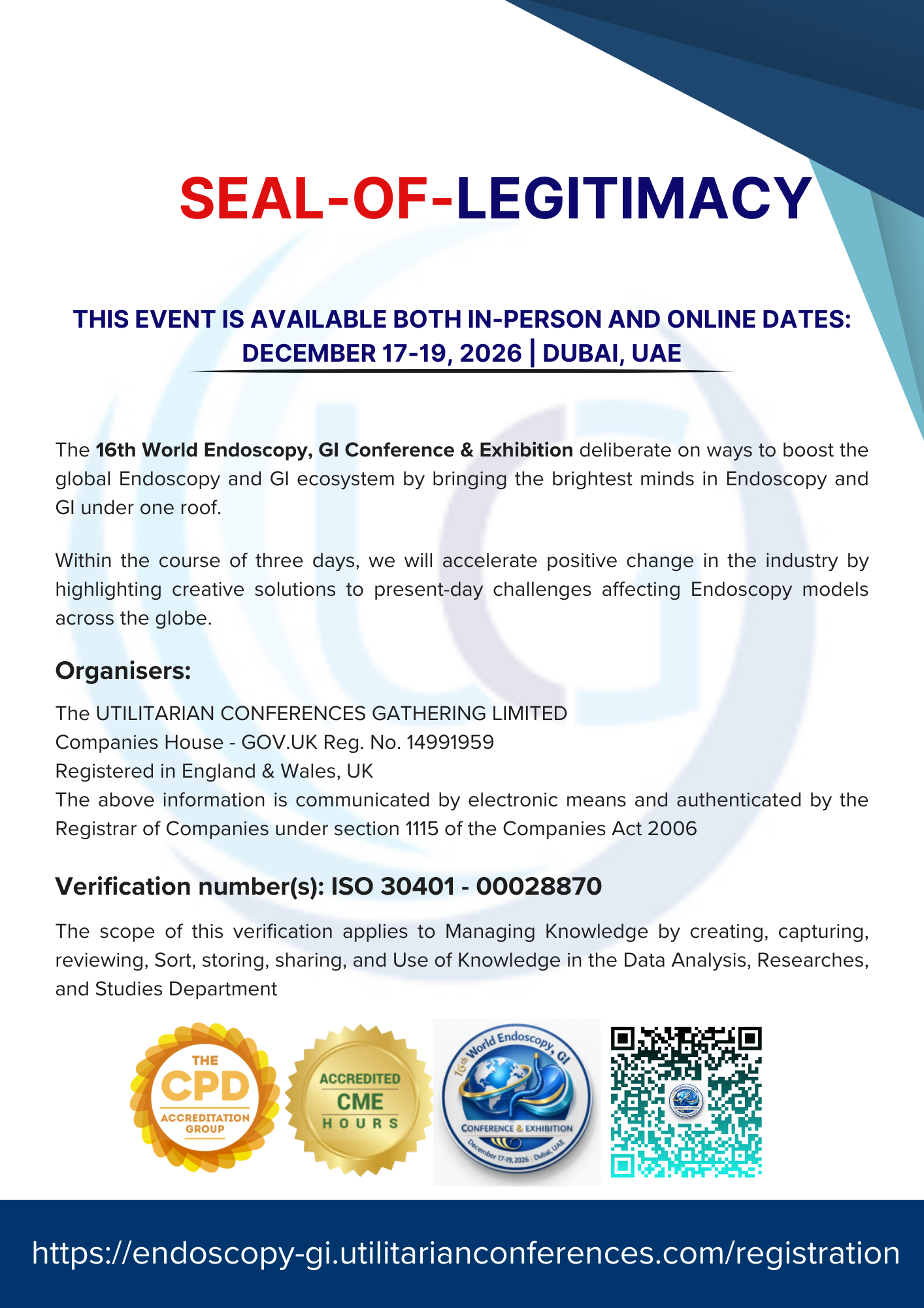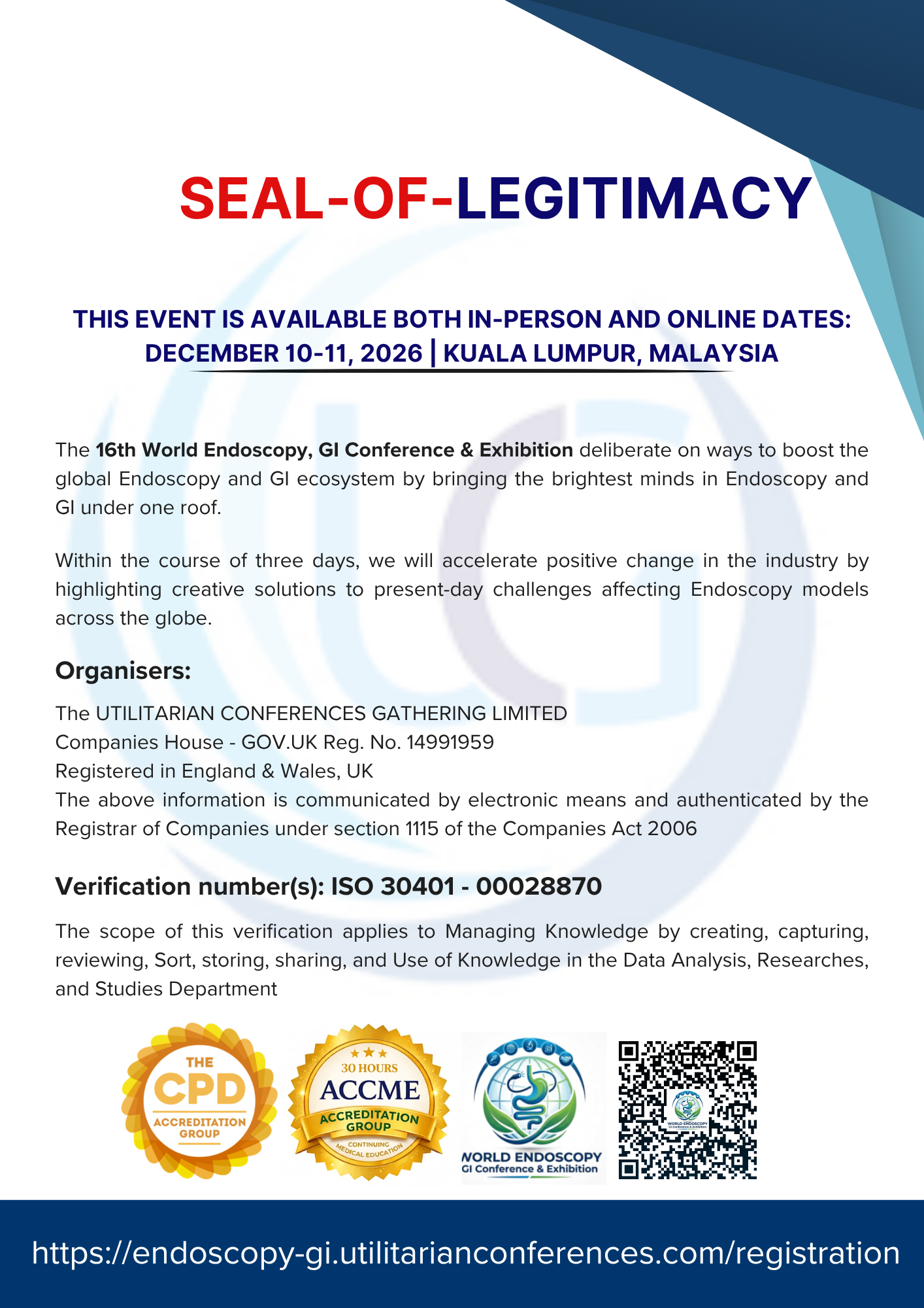 The Seal of Legitimacy for the 16th World Endoscopy, GI Conference & Exhibition affirms its recognition as a prestigious and credible platform for medical professionals specializing in endoscopy and gastroenterology.