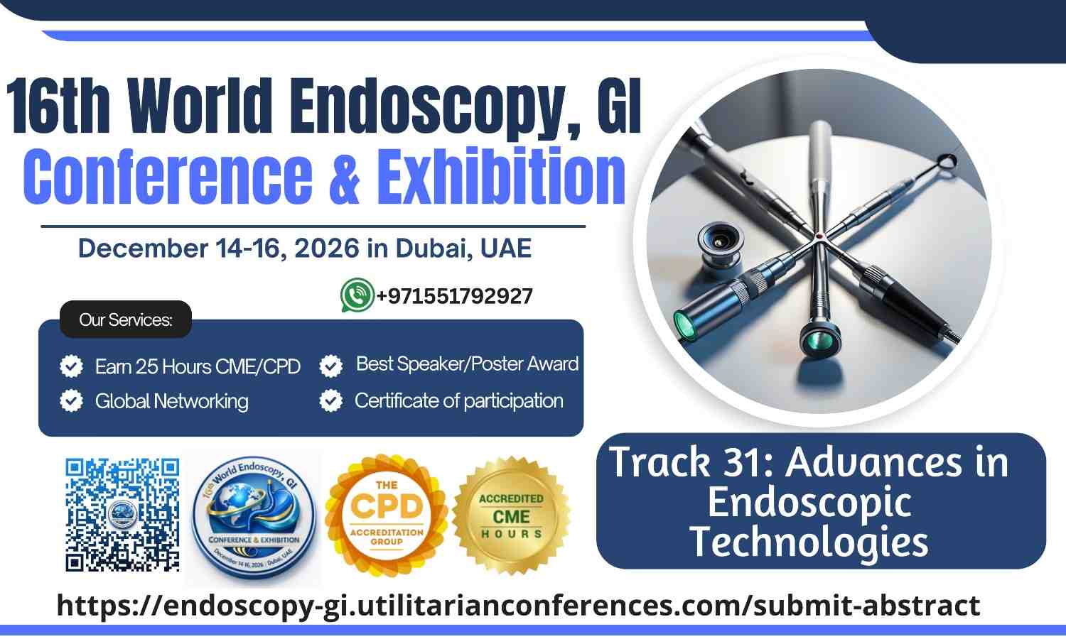 The 16th World Endoscopy, GI Conference & Exhibition is scheduled for December 14-16, 2026, in Dubai, UAE, with options for both in-person and virtual participation.