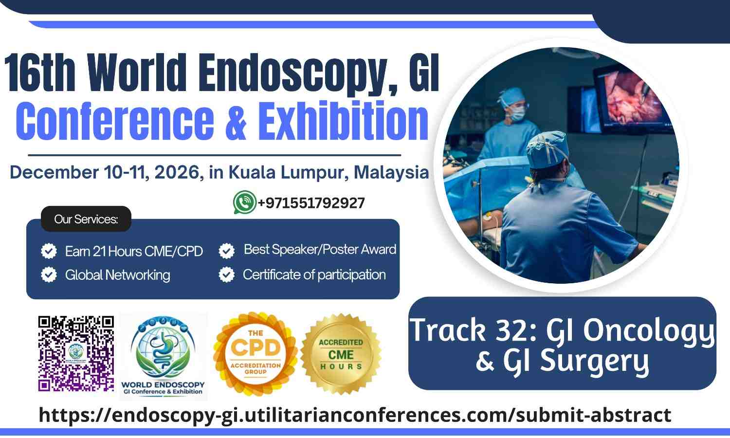 The 16th World Endoscopy GI Conference & Exhibition is scheduled for December 10-11, 2026, in Kuala Lumpur, Malaysia. One of the key tracks is Track 32: GI Oncology & GI Surgery, focusing on the latest advancements in gastrointestinal cancer diagnosis, treatment, and surgical interventions.