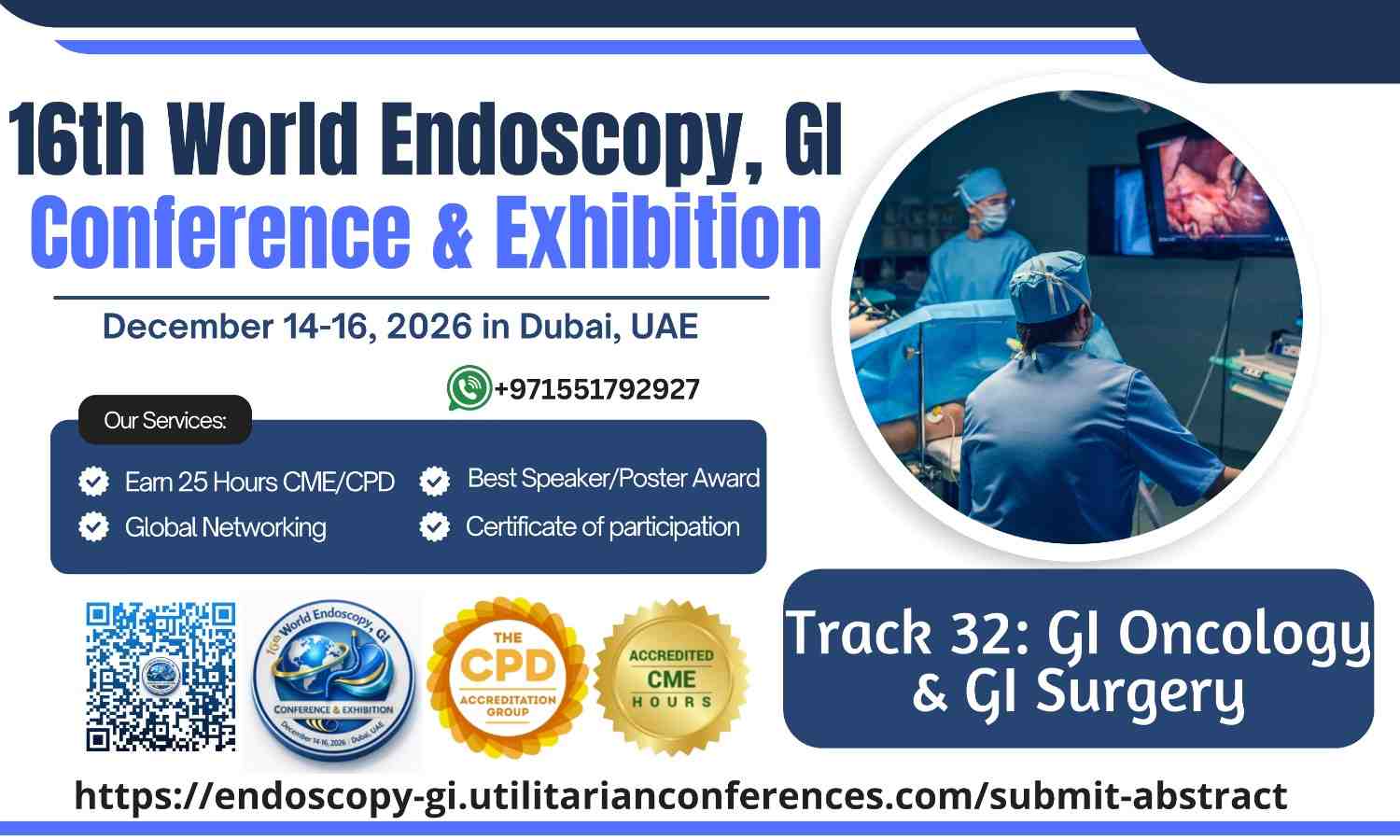 The 16th World Endoscopy GI Conference & Exhibition is scheduled for December 14-16, 2026, in Dubai, UAE. One of the key tracks is Track 32: GI Oncology & GI Surgery, focusing on the latest advancements in gastrointestinal cancer diagnosis, treatment, and surgical interventions.