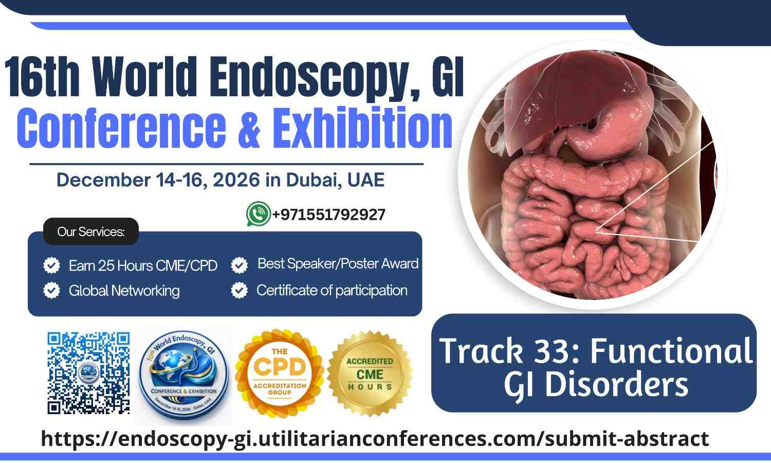 The 16th World Endoscopy GI Conference & Exhibition is scheduled for December 14-16, 2026, in Dubai, UAE. One of the key tracks is Track 33: Functional GI Disorders, focusing on the latest research, diagnostic approaches, and treatment strategies for functional gastrointestinal disorders.