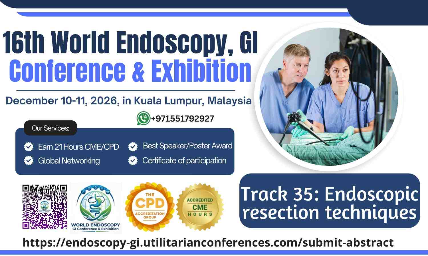 The 16th World Endoscopy GI Conference & Exhibition is scheduled for December 10-11, 2026, in Kuala Lumpur, Malaysia. One of the key tracks is Track 35: Endoscopic Resection Techniques, focusing on the latest advancements in minimally invasive procedures for gastrointestinal lesion removal.