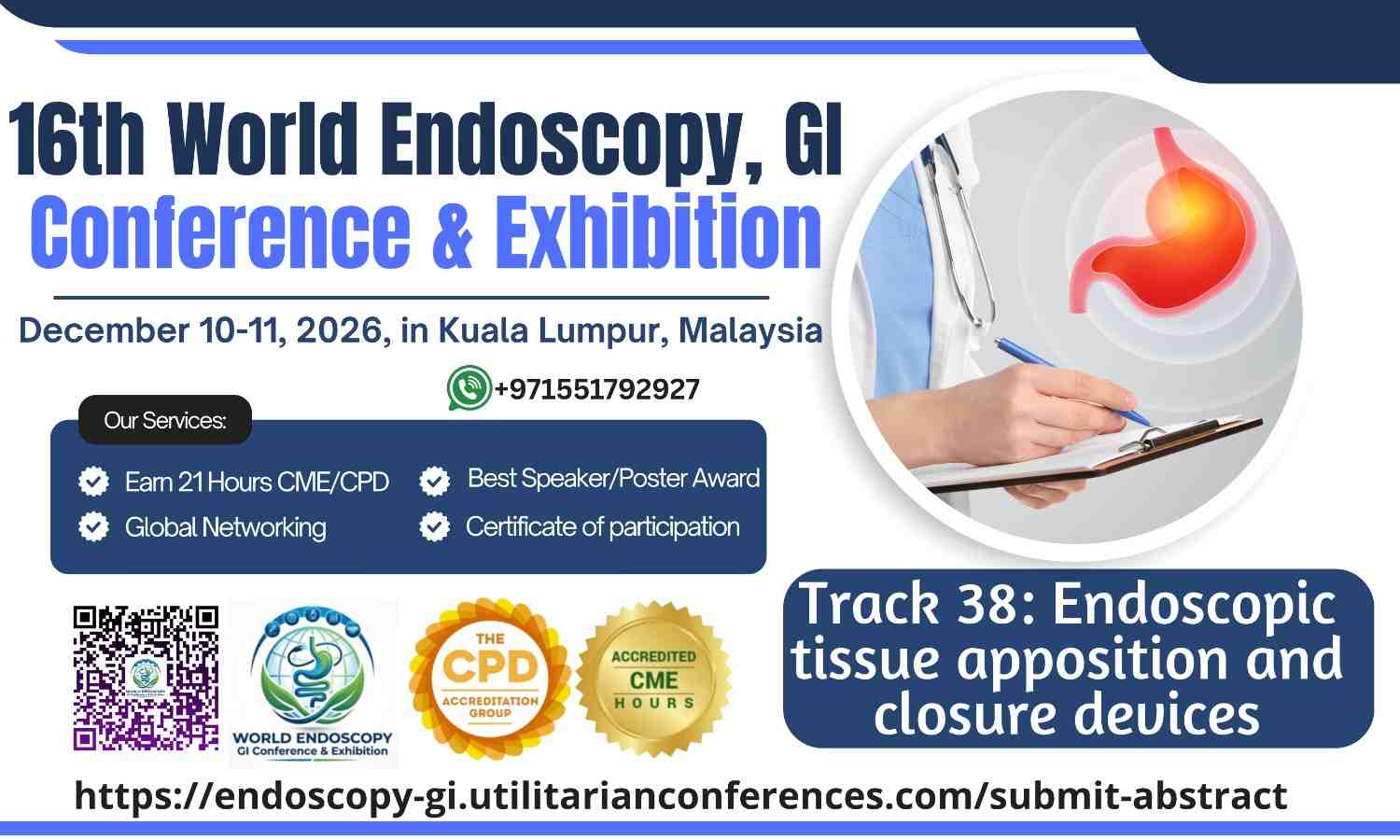 The 16th World Endoscopy, GI Conference & Exhibition is scheduled for December 10-11, 2026, in Kuala Lumpur, Malaysia. One of the key tracks is Track 38: Endoscopic Tissue Apposition and Closure Devices, focusing on the latest advancements in endoscopic methods for tissue approximation and closure.
